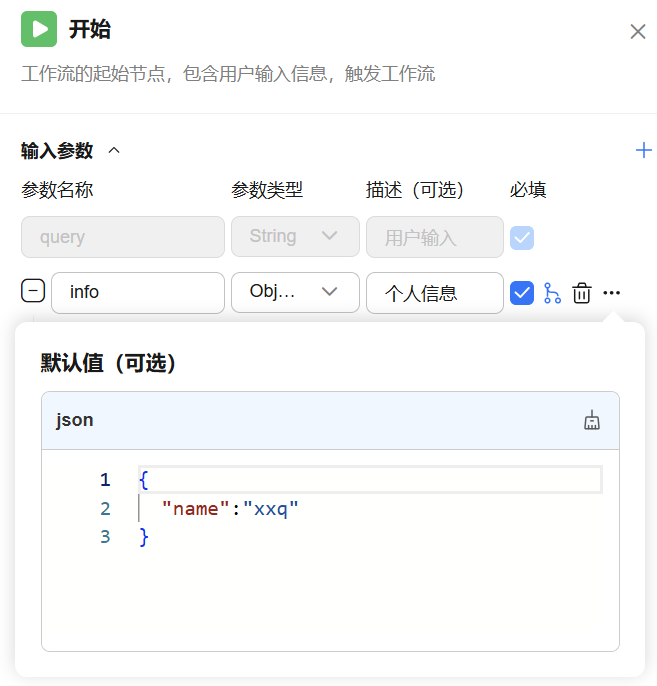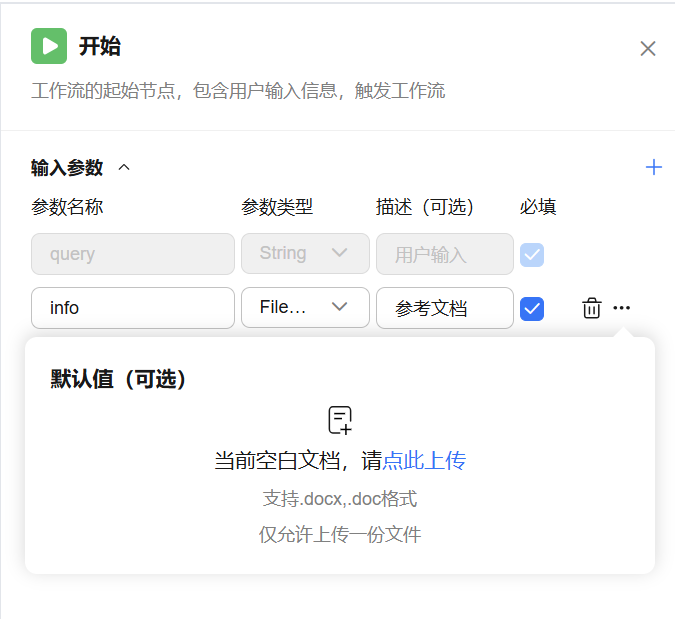 - 是否必选: 参数是否必选。若未指定必选参数,工作流无法执行。将工作流绑定到智能体中使用时,如果用户Query中缺少必选参数,则不会触发工作流调用。
