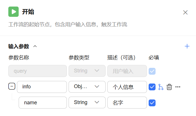 开始节点是一个工作流的起始节点,用于设定启动工作流所需的输入参数。开始节点只有输入参数,没有输出等其他参数。开始节点中默认有一个输入参数query,表示用户在本轮对话中输入的原始内容。你也可以按需添加其他参数,用于下游节点的输入。