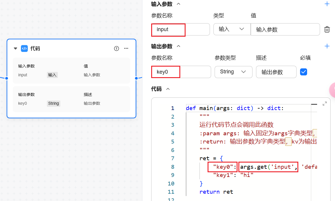 def main(args: dict) -> dict: # 注意在输入参数中定义名为input1的变量 input1 = args.get('input1') # 注意在输入参数中定义名为input2的变量 input2 = args.get('input2') res = { # 注意在输出参数中定义名为res的变量 "res": input1 + input2, } return res