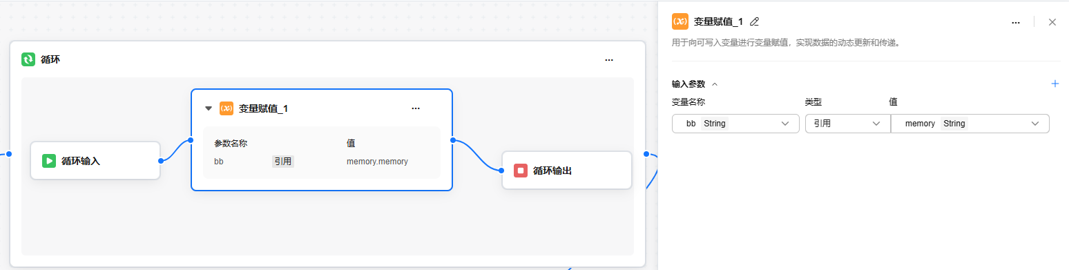 变量赋值节点支持在循环体内部引用,只支持更改循环体中间变量的值,被赋值变量仅支持选择中间变量,值可支持引用或输入两种。适用于循环过程中动态更新中间变量,自定义循环逻辑中进行参数传递的场景。