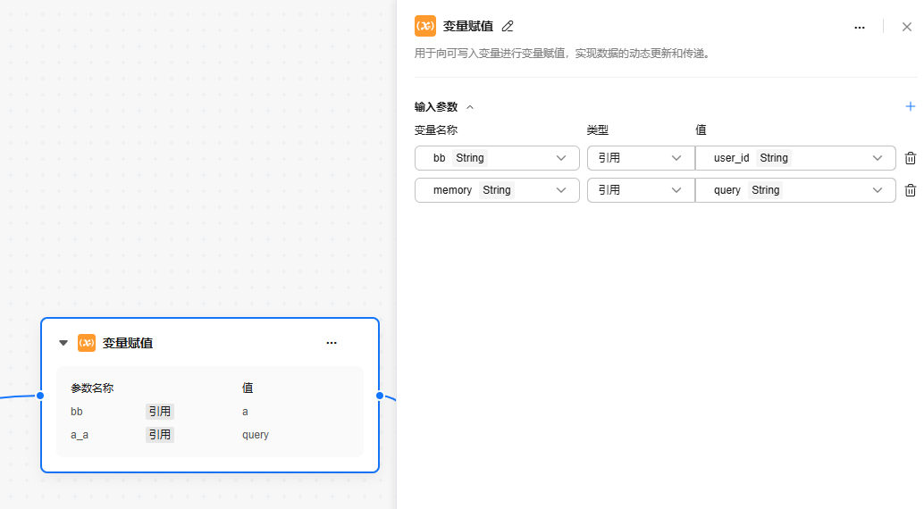 变量赋值节点变量名称仅支持全局配置中记忆变量引用,值可支持引用或者输入两种。