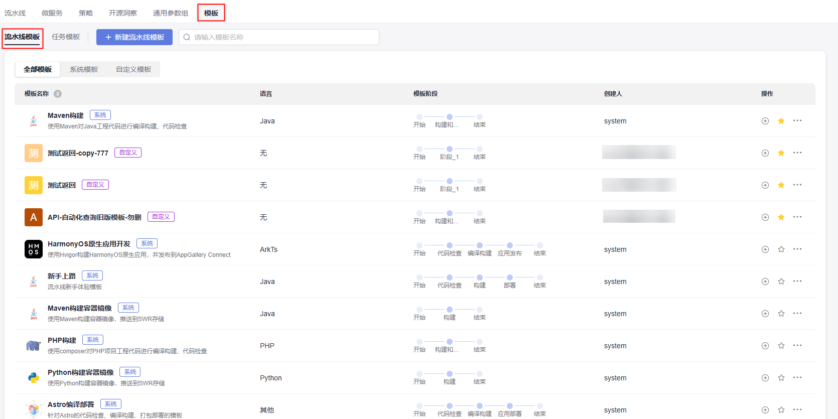 - 首页入口:进入流水线服务首页,默认展示“流水线列表”页面,单击“流水线模板”,进入“流水线模板”页面。