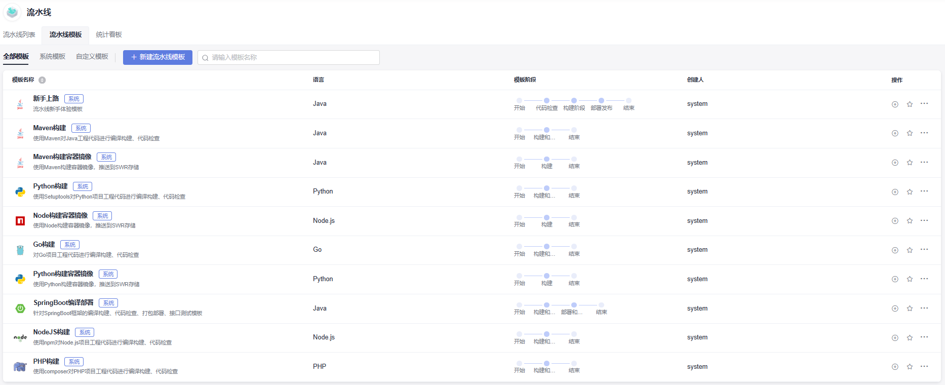 - 系统模板只能用来复制或生成流水线,不能编辑和删除。