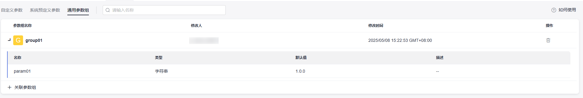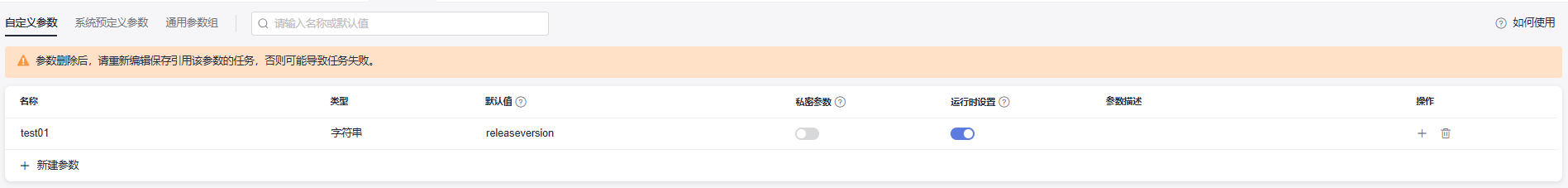 - 当存在同名参数时,参数优先级为:系统预定义参数 > 自定义参数 > 通用参数组。