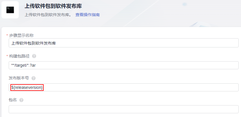 - 单击“构建步骤”,切换至“构建步骤”页面,单击“点击添加构建步骤”,选择“上传软件包到软件发布库”,将鼠标移动至插件卡片,单击“添加”,将“发布版本号”配置为引用参数形式。在参数输入框输入“$”符号后会自动出现参数列表,选择上一步已经新建好的releaseversion参数。使用“$”符号引用通用参数组的参数时不会自动生成提示。