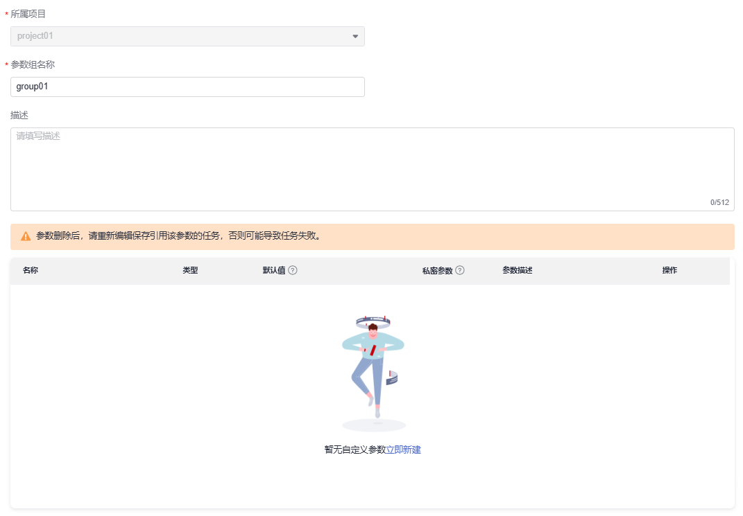 - 单击参数列表下的“立即新建”(已存在自定义参数,则单击“新建参数”),填写参数信息。