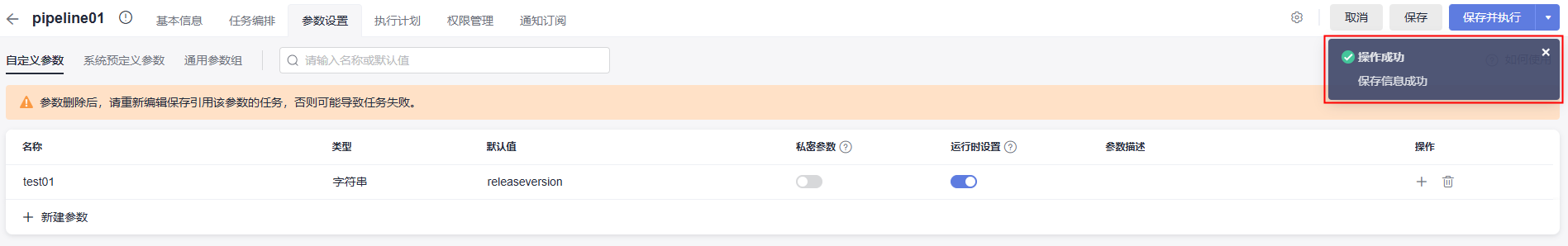 - 配置完成后,单击“保存”,弹出“保存信息成功”提示,保存流水线成功。
