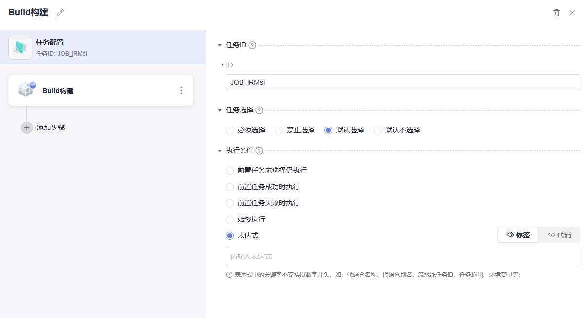 - 单击“任务配置”,在“执行条件”参数项选择“表达式”,即可配置流水线阶段任务执行条件的表达式。如果是新建阶段任务,需添加插件后再单击“任务配置”。