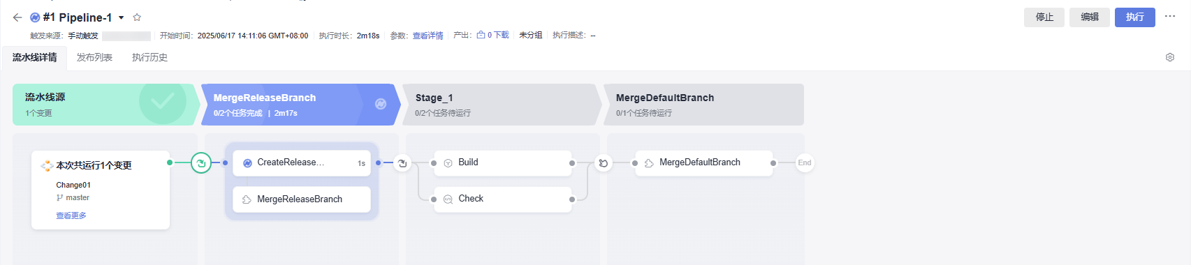 - 配置完成后,单击“执行”,进入变更流水线执行详情页面。