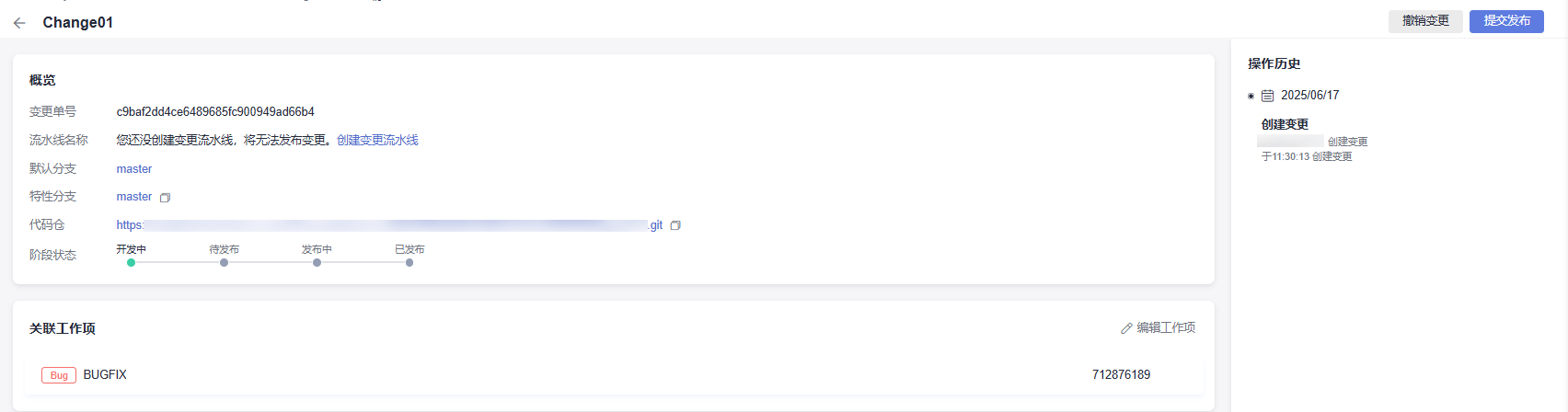 页面展示变更概览信息、关联工作项、操作历史,还可以对变更执行提交发布、退出发布、撤销变更操作。