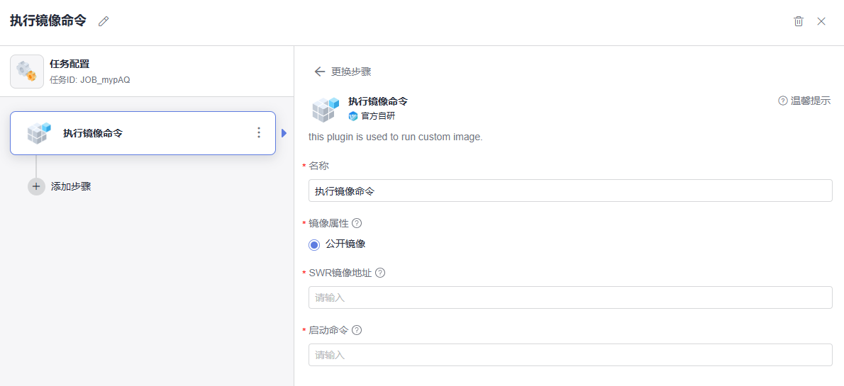 通过“执行镜像命令”插件,可以将用户在SWR上的公开镜像下载到自定义执行机并启动。