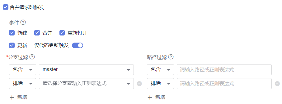 - 更新:合并请求内容更新、设置更新或者源代码更新时触发,打开“仅代码更新触发”,则仅源代码更新时触发。