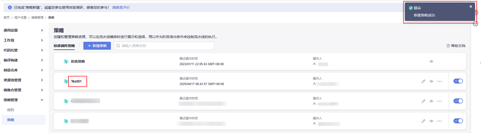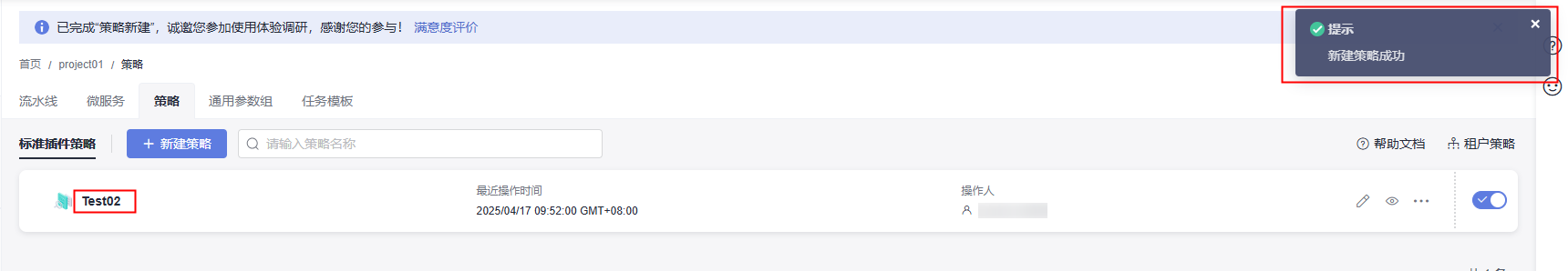 - 单击“确定”,弹出“新建策略成功”提示,即在策略列表生成一条项目级策略。