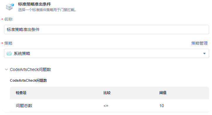 - 当前仅支持“标准策略准出条件”,可以选择当前项目或租户下创建好的策略。