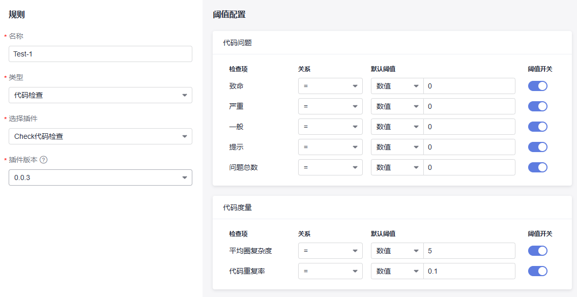 根据选中的插件版本自动获取的插件输出阈值配置,根据需要为插件输出设置比较关系。规则阈值将用于策略,并最终配置到流水线中作为流水线阶段准出的判断条件。