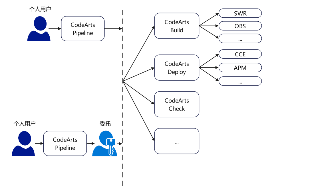 - 配置委托后:您只需要有运行流水线的权限,不需要有流水线中调用的其他云服务的权限,后续任务会使用委托的身份及权限运行。