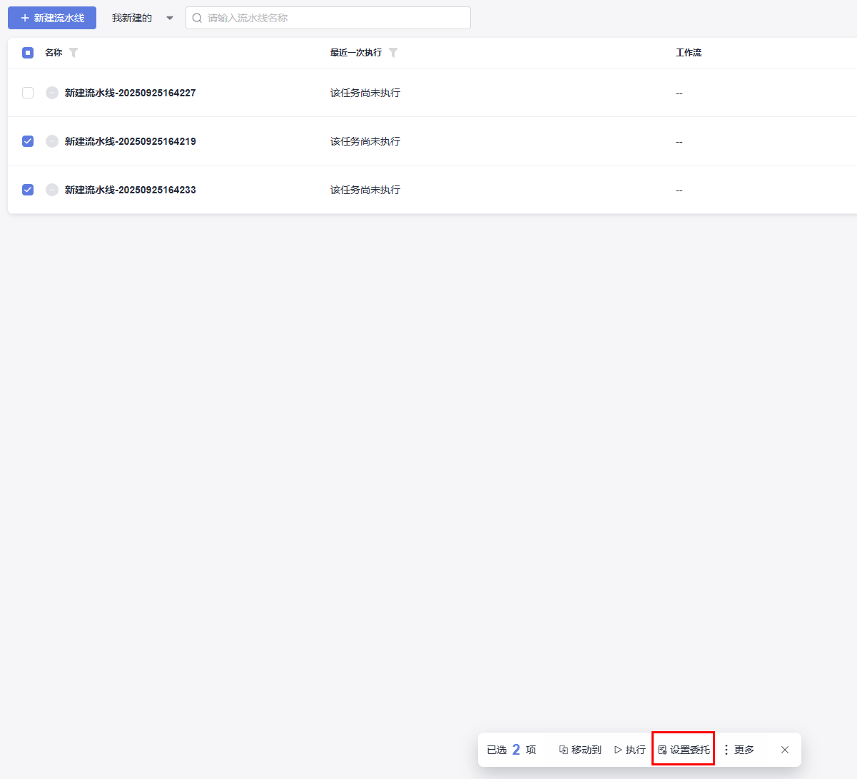- 在流水线列表页面中,勾选需要批量配置委托的流水线,单击“设置委托”。