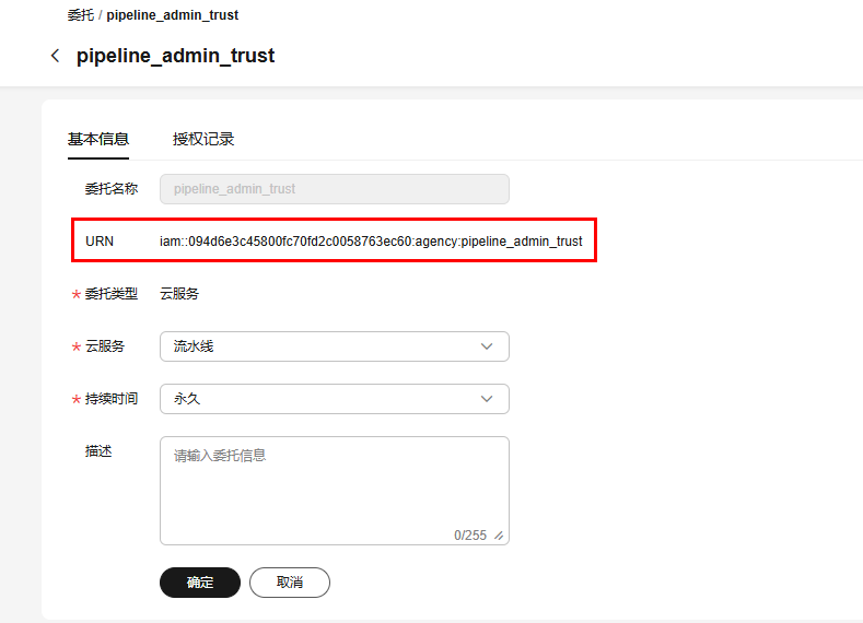 - 勾选“我同意以上授权”,单击“确认”,即可自动创建CodeArts Pipeline服务的默认委托(默认委托名称: pipeline_admin_trust)。