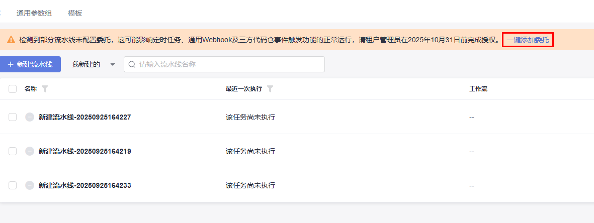 - 在完成默认委托的创建后,进入流水线列表页,点击上方提示中的“一键添加委托”。