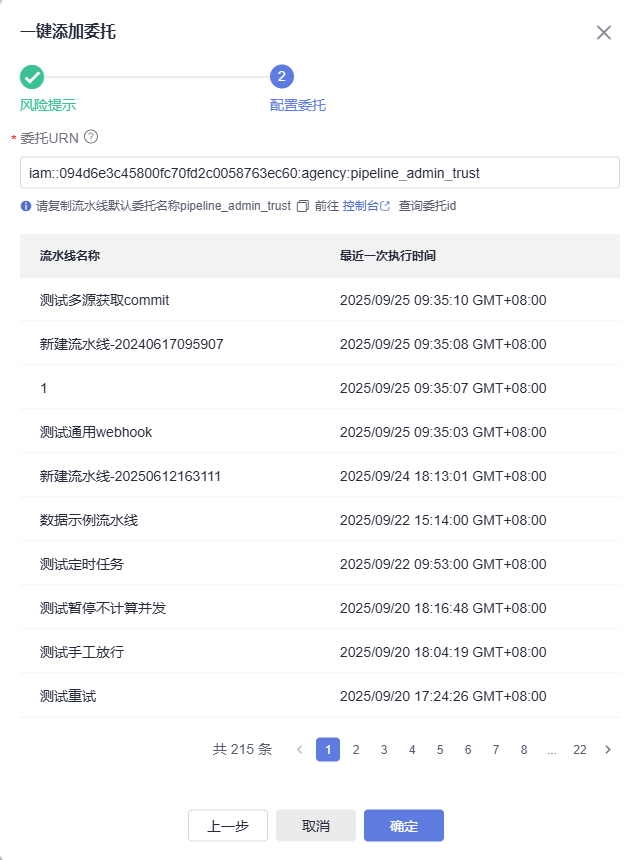 - 弹出“批量设置委托”弹窗,输入委托URN,单击“确定”,完成批量配置流水线委托。