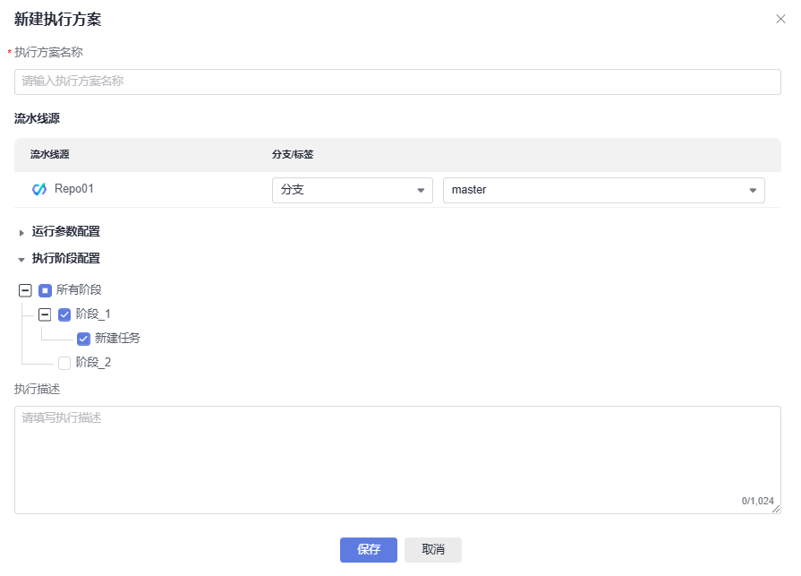 ,选择“执行方案”。 - 单击“新建执行方案”,填写执行方案名称,配置流水线源信息、配置运行参数、选择执行阶段、填写执行描述,配置方法同执行流水线。