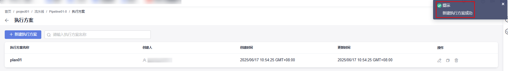 - 单击“保存”,弹出“新建执行方案成功”提示,完成执行方案的新建。可根据需要进行编辑、复制、删除。
