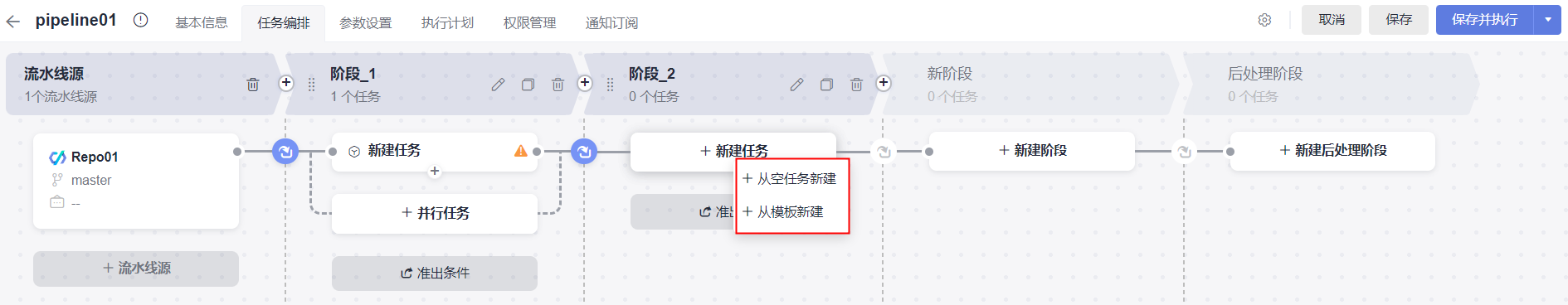 ,选择“编辑”。 - 进入流水线“任务编排”页面,单击阶段下“新建任务”,可根据需要选择从“空任务新建”或“从模板新建”。使用空模板新建流水线时,“阶段_1”的“新建任务”默认为空任务,无法选择任务模板。