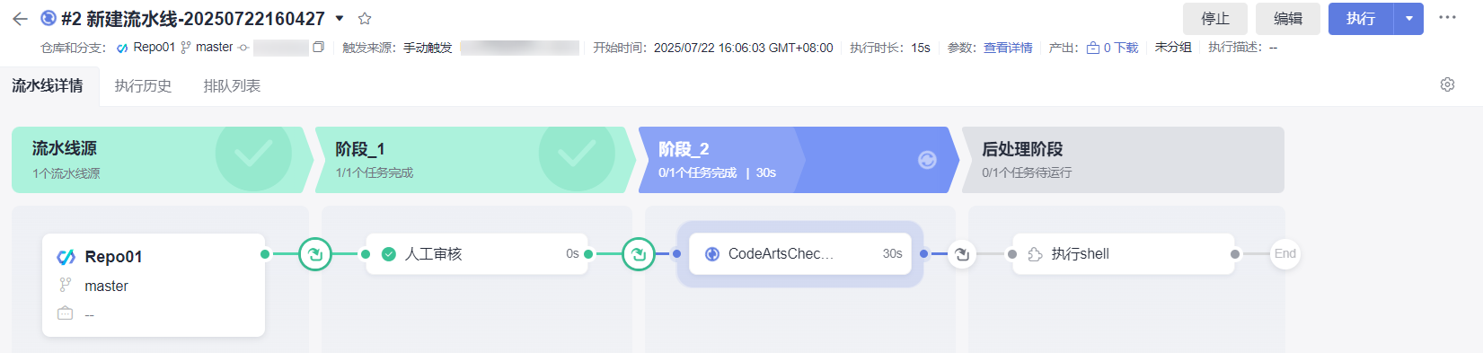 - 单击“执行”,进入流水线详情页面,可实时查看流水线执行进展及任务执行状态。