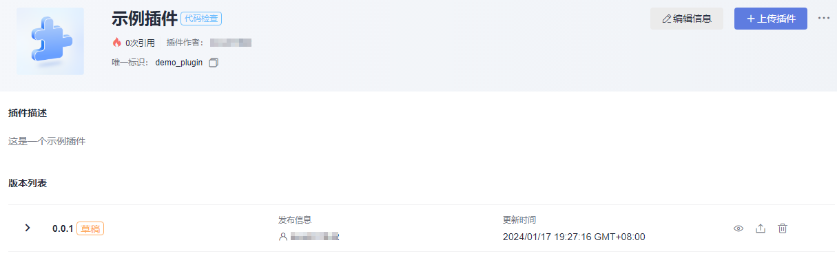 草稿版本可以同版本多次覆盖,但正式版本不可重复更新,只可以单击右上角“上传插件”重新上传插件新增版本。