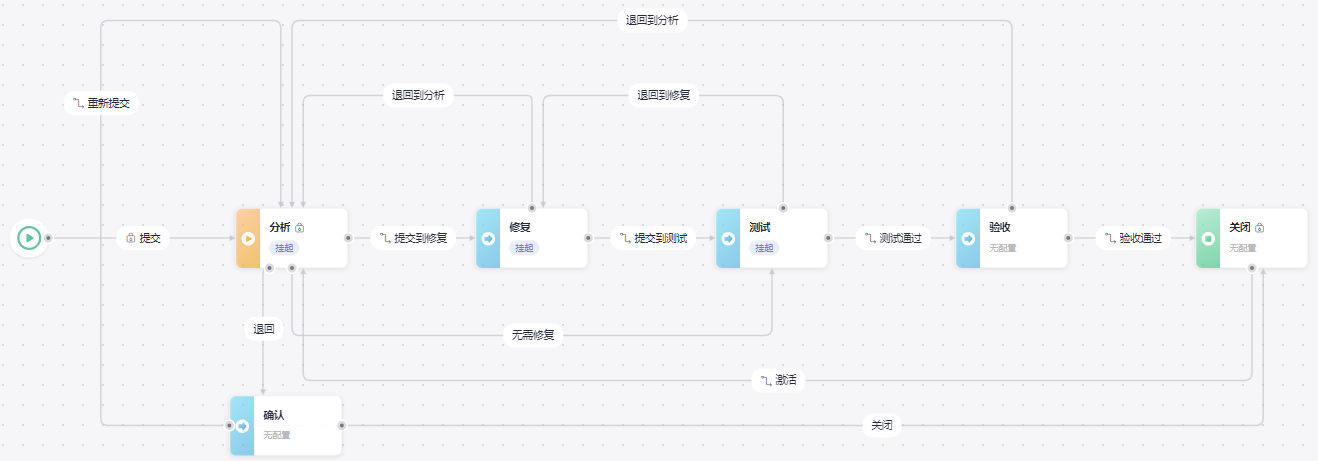 缺陷的全生命周期共有分析、修复、测试、验收、关闭五个状态。完整的转状态流程图如图1所示。