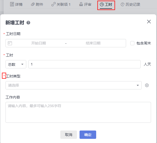 开启后,在工作项页面增加工时,“工时类型”前会带红色星号,表示为必填项。
