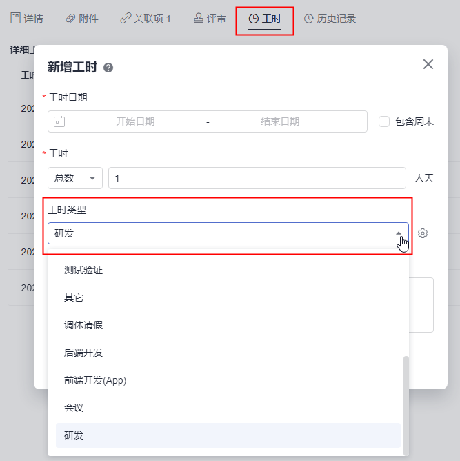 新建成功后,在工作项页面增加工时,可选择自定义的工时类型。