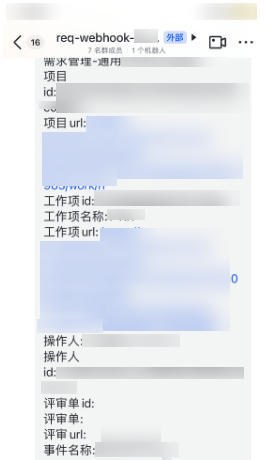{"msgtype": "text","text": {"content": "需求管理名称Req:项目id:${project.id}工作项名称:${issue.title}操作人:${operator.username}操作人id:${operator.id}评审:${review.title}评审url:${review.url}事件名称:${operation}工作项链接:${issue.url}"}} - 飞书的参数示例: