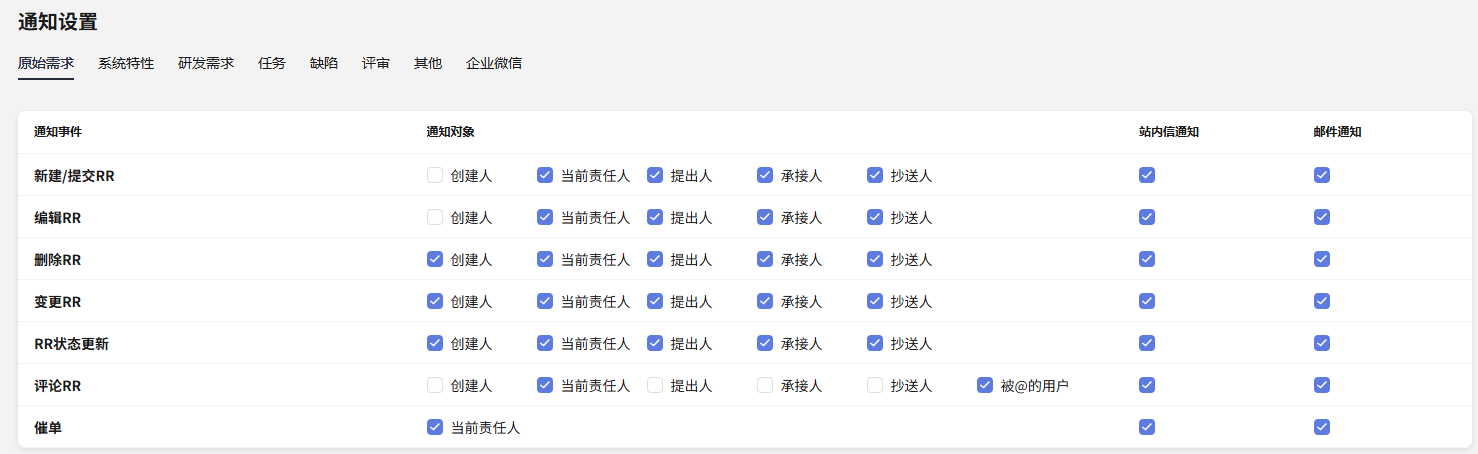 您可以在通知设置页面根据需要选择通知对象和事件类型,配置完成后,当发生相应的事件(如修改RR)时,被勾选的通知对象会收到相应的通知。