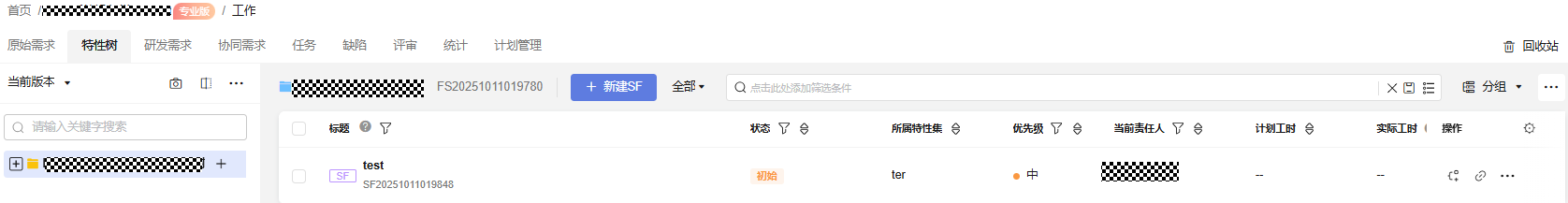 - 单击“确定”,系统会自动跳转到特性树列表页,页面右上角给出“新建SF成功”的提示。