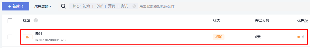 - 单击“确定”,系统会自动跳转到研发需求主页,并在主页右上角给出“新建IR成功”的提示。