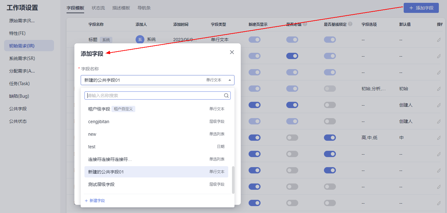 字段管理是租户级的公共字段库,在此页面中新建的字段,可以配置在租户下所有IPD类型项目工作项中。