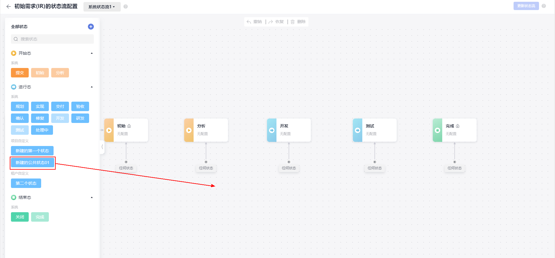 - 在项目的中,初始需求(IR)已配置的状态流转中会显示参数“新建的公共状态01”。