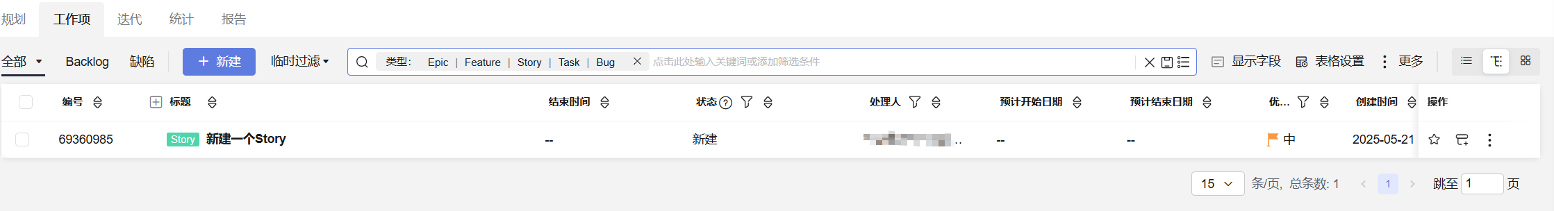 - 单击“新建”,根据需要选择工作项类型(以“Story”为例)。