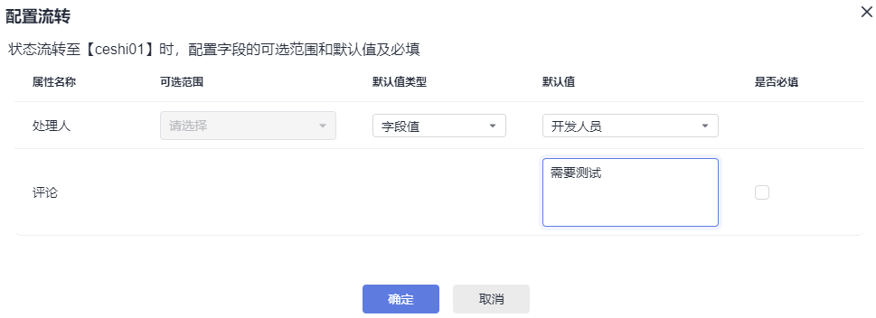 ,可根据需要设置当工作项流转至“cehsi01”时,配置处理人的默认值和可选范围,配置评论的默认值及是否必填。
