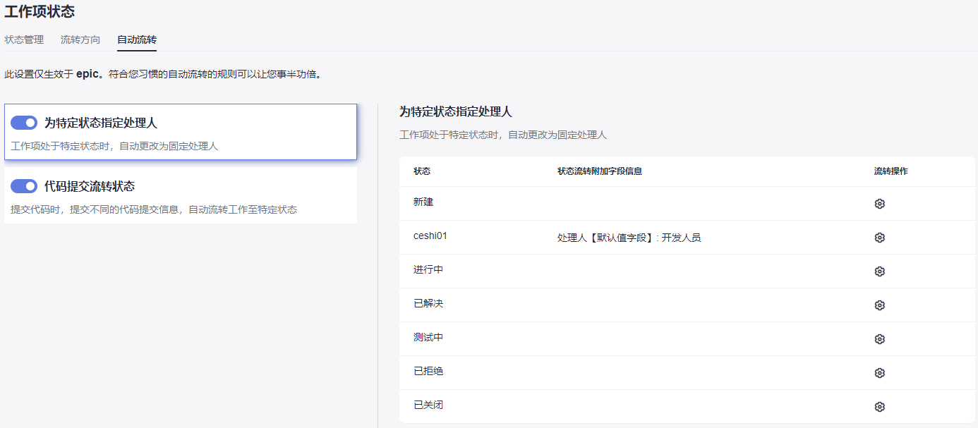 - 在左侧导航中,选择,进入Epic工作项状态页面,选择“自动流转”页签 ,默认选择“为特定状态指定处理人”。