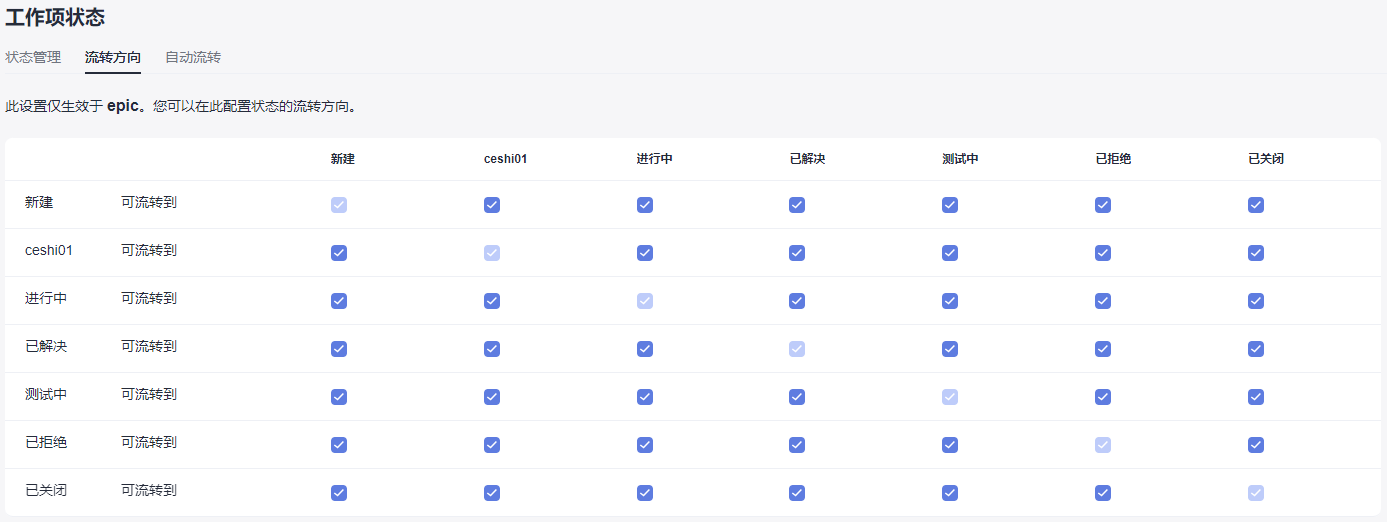 - 在左侧导航中,选择,进入Epic工作项状态页面,选择“流转方向”页签