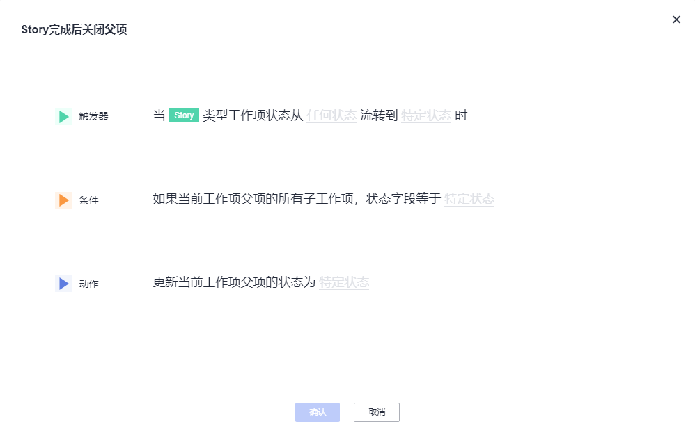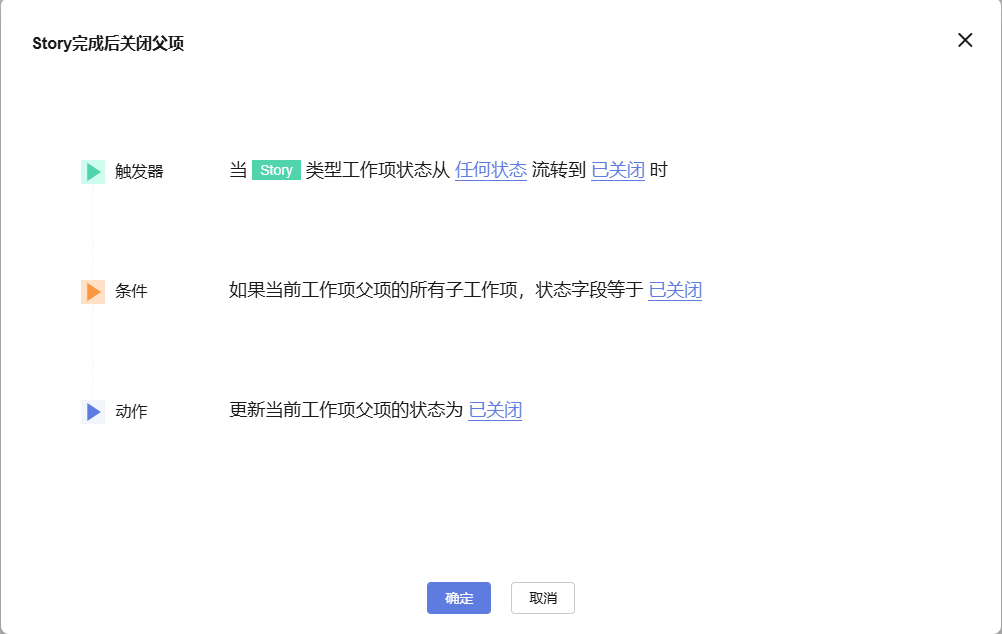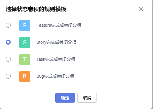 - 在“选择状态卷积的规则模板”弹框中,选择“Story完成后关闭父项”,单击“确认”,进入规则配置页面。