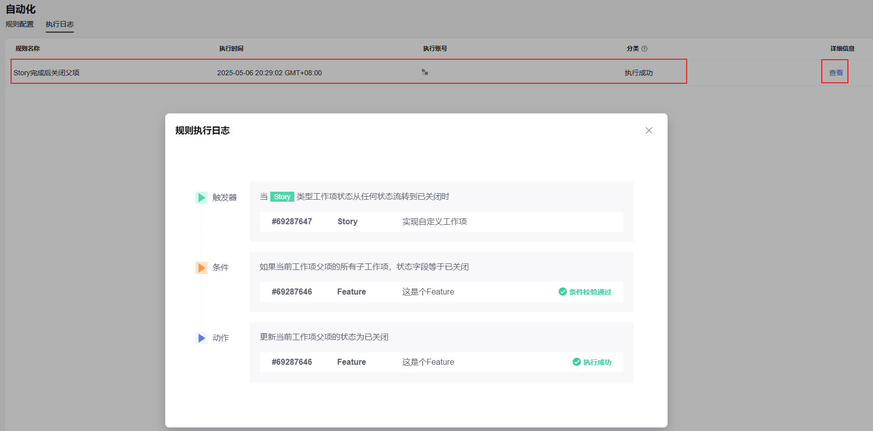 - 重新进入工作项列表,该Feature类型的工作项状态自动更新为“已关闭”,同时该工作项详情页的操作历史页面会新增一条自动化规则操作历史。