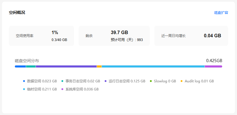 - 在“容量预估”页面,可以查看磁盘空间使用情况,容量不足时,及时扩容磁盘。