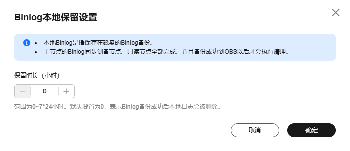 范围为0~7*24小时。默认设置为0,表示Binlog备份成功后本地日志会被删除。