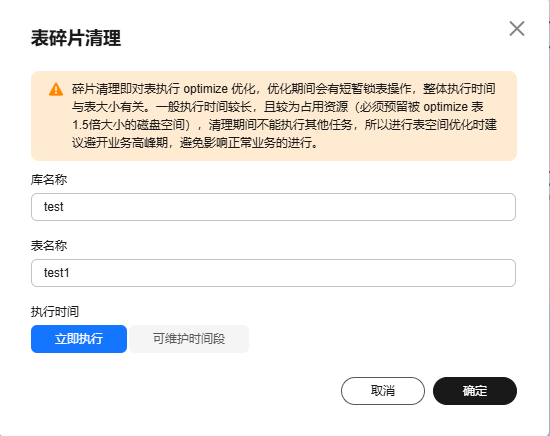 在Top50表页面,单击目标表操作列的“碎片清理”,选择执行时间,单击“确定”,在弹出提示框中二次确定。