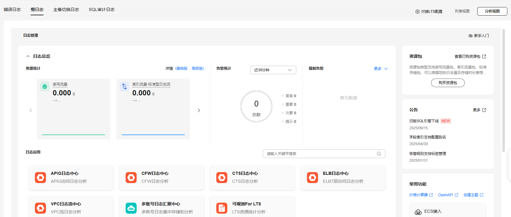 - 在左侧导航栏单击,右侧选择“慢日志”。