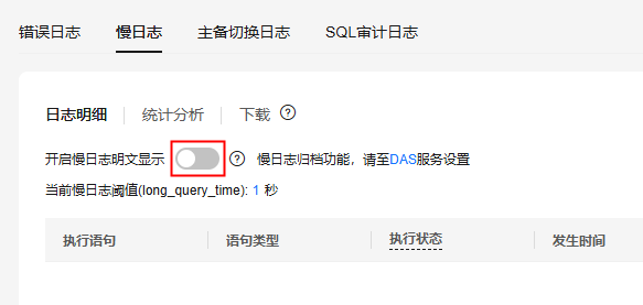 - 在“日志明细”页签下,单击“开启慢日志明文显示”右侧开关