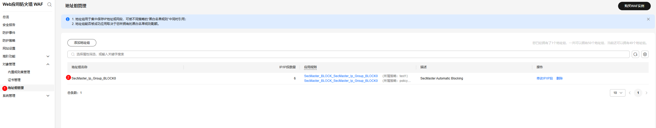 - 剧本触发后,在Web应用防火墙 WAF侧的 可查看,WAF侧自动新建的IP地址组。